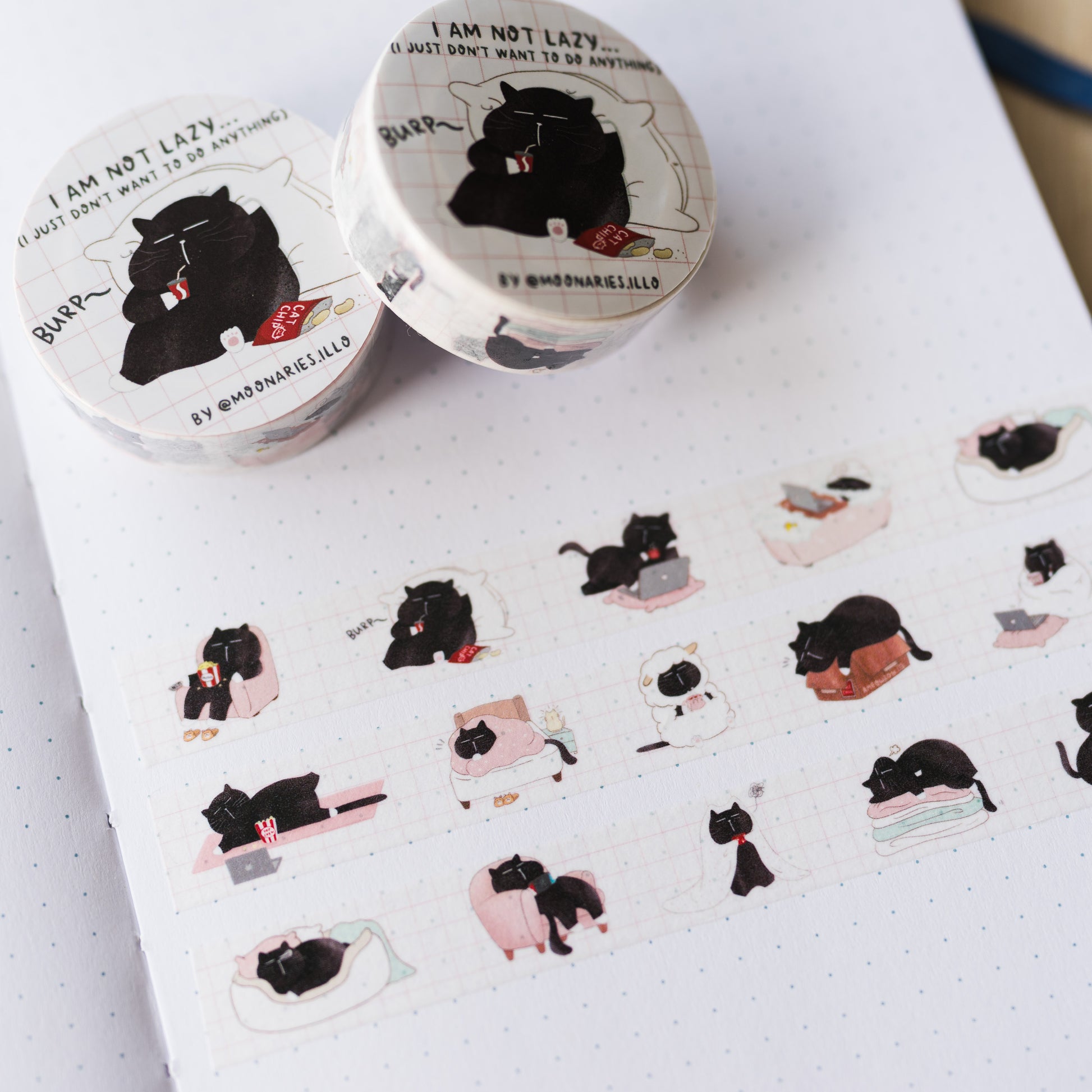 This "I'm Not Lazy, I Just Don't Want to Do Anything" washi tape captures the essence of feline leisure with cute illustrations showcasing Mocha Cat in various states of relaxation, from blissful catnaps to moments of doing nothing.