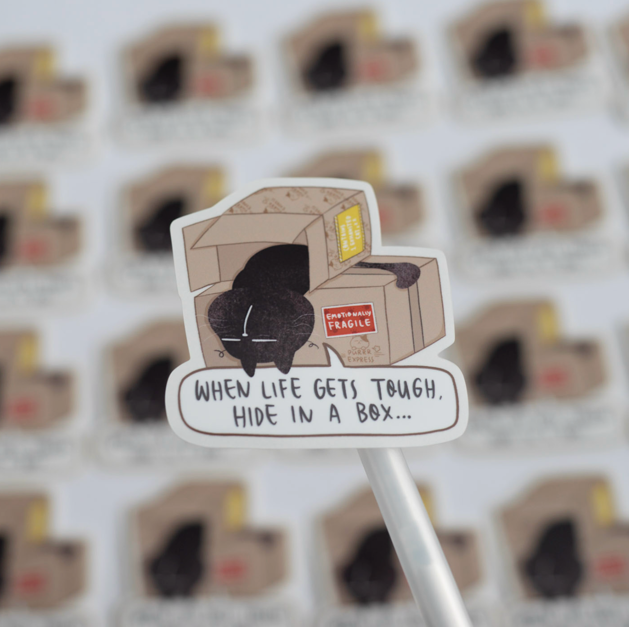 This cosy sticker features Mocha cat tucked inside a box with the message “When life gets tough, hide in a box…”. It is perfect for planners, journals, water bottles, laptops, or anywhere you need a little emotional support 🫶
